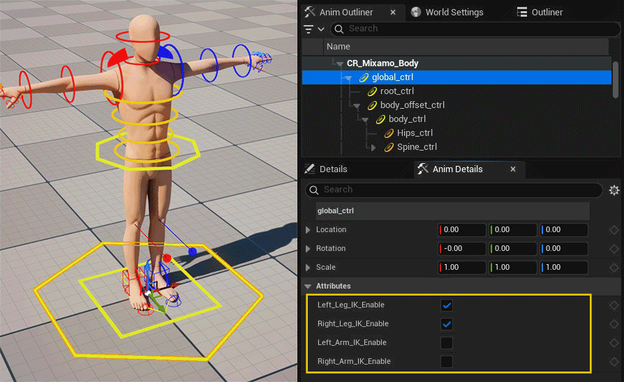 The IK / FK mode for the arms and legs can be changed from the Anim Details panel for the global_ctrl. Switching modes will automatically add keyframes for the relevant controls in the timeline for a seamless transition between modes.