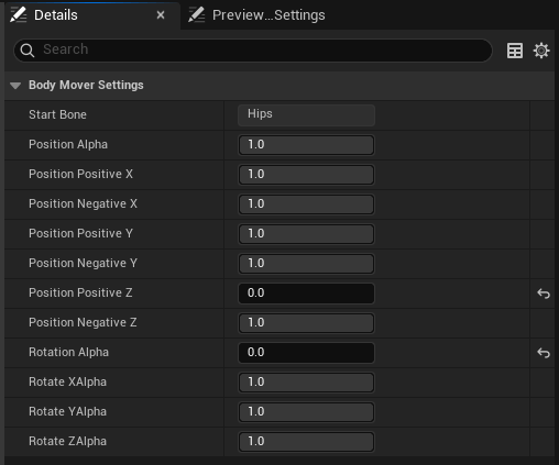 In the Details panel, set the Rotation Alpha and Position Positive Z weights to zero. This will remove unwanted body rotation and prevent the character from floating in the air to reach IK target positions.