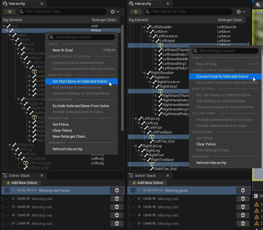 3. Select the Body Mover solver, then right click on the Hips bone in the hierarchy and select Set Start Bone on Selected Solver. Then select the IK Goal for each Limb (displayed with a yellow box icon) and right click and select Connect Goal to Selected Solver.