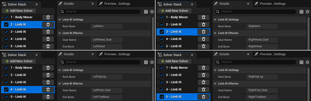 2. Click the Add New Solver button to add a Body Mover solver, followed by four Limb IK solvers.