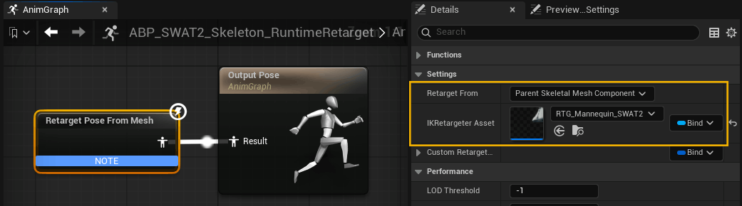 Open the animation blueprint, add a Retarget Pose From Mesh node and connect it to the Output Pose. In the details panel for the node, make sure the Retarget From option is set to Parent Skeletal Mesh Component, and set the IKRetarget Asset to the Mannequin-to-Mixamo retargeter asset generated by the plugin (RTG_Mannequin_<Mixamo-Skeleton>).