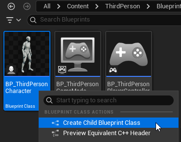 3. Create a new child blueprint (or duplicate) of the third person blueprint ThridPerson > Blueprints > BP_ThirdPersonCharacter.