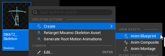 2. Create a new animation blueprint for the Mixamo character by right clicking on the skeleton asset and selecting Create > Anim Blueprint. This will be used to perform the run-time retargeting on the Mixamo character.