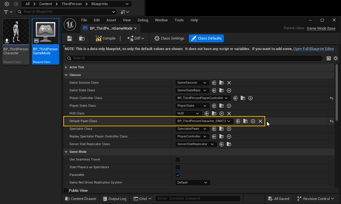 4. Open the Game Mode asset ThirdPerson > Blueprints > BP_ThirdPersonGameMode and change the Default Pawn Class to the new blueprint.